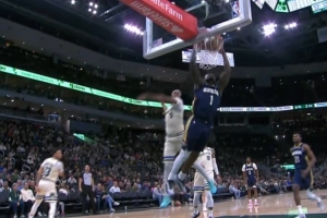 看我来秀一个!锡安胯下突破杀入内线 不怵特纳补防上演折叠暴扣GIF-锡安胯下突破杀入内线迎着防守上演折叠暴扣