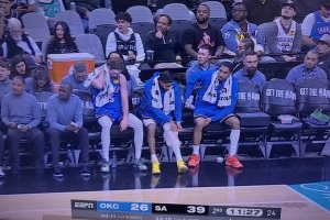 又一名场面!雷霆10标准合同球员缺阵 替补席就三名球员等待轮换雷霆客场挑战马刺,本场比赛雷霆超级残阵,10个标准合同球员缺阵:卡鲁索、吉昂(未随队)、多特、亚历山大、哈滕、切特、米切尔、索伯、托皮奇和杰伦威。比赛期间,雷霆记者晒出替补席的“惨状”,就三名球员等待