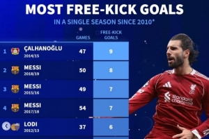2010以来单赛季任意球进球:恰20居首、梅西二到四名,索博第22体育资讯2月10日讯利物浦在本轮英超1-2被曼城逆转,索博斯洛伊打进直接任意球,本赛季已4进任意球。数据统计显示,他也能在2010年后的五大联赛球员单赛季各项赛事任意球进球榜位列第22位。2010年后的
